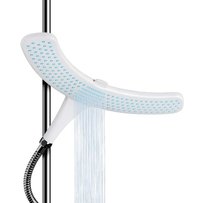 Komfortabel duschen, ohne dass dabei Ihre Haare nass werden? Mit dem Duschkopf Doosh von Stefan Raab kein Problem mehr. Auf Schulterhöhe eingestellt ermöglicht Ihnen der breite Wasservorhang aus 204 Strahldüsen ein angenehmes Wellness-Duschen – und die Haare bleiben trocken. Durch den angenehmen Wasservorhang spritzt das Wasser nicht hoch und Ihre Schultern werden gleichmäßig nass und warm. So können Sie zum Beispiel auch ganz entspannt Ihre Haarkur einwirken lassen. Zum Haarewaschen stellen Sie ganz einfach per Knopfdruck auf den zentralen Powerstrahl um. Doosh ist sparsam im Wasserverbrauch und wird aus kontrollierten Materialien in Deutschland hergestellt. Der Design-Duschkopf passt auf jeden handelsüblichen Anschluss. Der Austausch dauert weniger als 1 Minute.