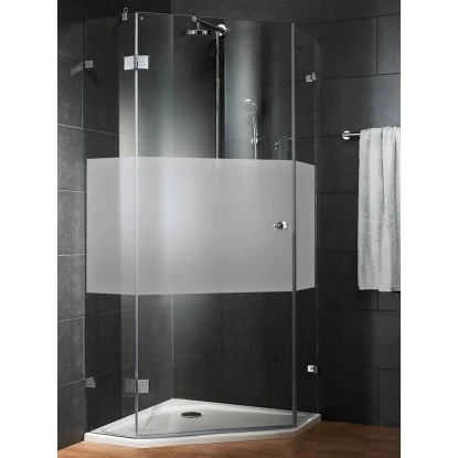 Die 3-teilige Fünfeckdusche besteht aus 8 mm Einscheiben-Sicherheitsglas. Die eckigen innen bündigen Scharniere sind bereits vormontiert und schließen innen bündig mit der Glasfläche ab. Die Reinigung Ihrer Duschkabine wird damit zum Kinderspiel. Durch den verdeckten Heb-Senk-Mechanismus der Scharniere hebt die Tür beim Öffnen leicht an und senkt sich beim Schließen wieder ab. Erhöhte Dichtigkeit und zuverlässiges Schließverhalten sind dadurch garantiert. Der verdeckte Heb-Senk-Mechanismus wird erst beim Bewegen der Tür bemerkbar. Durch das Dekor Dezent erhält diese Dusche einen eleganten Look.