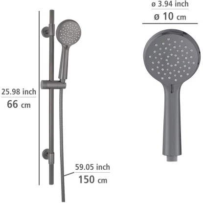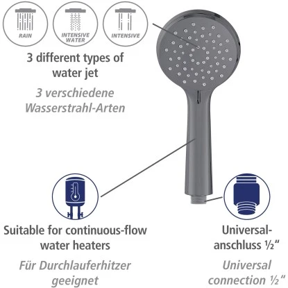 Das ideale Duscherlebnis ganz nach Ihren Wünschen bietet das Brauseset Young von WENKO in der Farbe Gunmetal Grey. Das Set besteht aus einer Duschstange, einem Duschschlauch und einer Handbrause mit 3 verschiedenen Wasserstrahl-Arten, die individuell ausgewählt werden können.