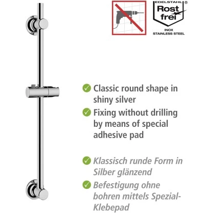 Wer Bohrlöcher vermeiden möchte oder muss, liegt mit der Wenko Duschstange Chrom genau richtig. Wie der Name schon verrät, gelingt die Montage der Brausestange ganz ohne die Bohrmaschine. Innerhalb von Minuten wird die Stange mithilfe eines Spezial-Klebepads und innovativen Wandhaltern an der gewünschten Stelle befestigt. Die Duschstange ohne Bohren ist aus hochwertigem, rostfreiem Edelstahl hergestellt und verfügt über einen integrierten Halter für den Duschkopf. Die Handbrause lässt sich so ganz leicht auf die gewünschte Höhe verschieben, um Ihnen ein entspanntes Duscherlebnis zu ermöglichen. Die Brausestange misst insgesamt (B/T x H): Ø 2,2 cm x 70 cm.